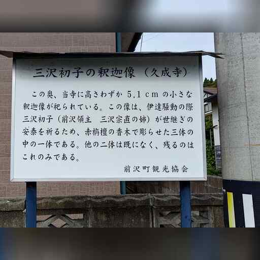 三沢初子の釈迦像(久成寺)の案内板があります。伊達騒動の時のもので、高さ5.1cmと小さく、3体のうち1体のみ現存するとあります。