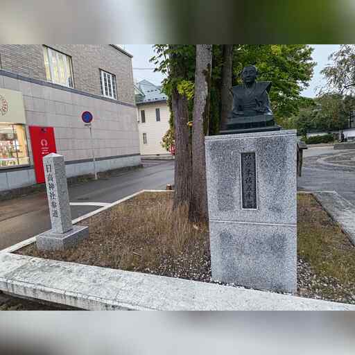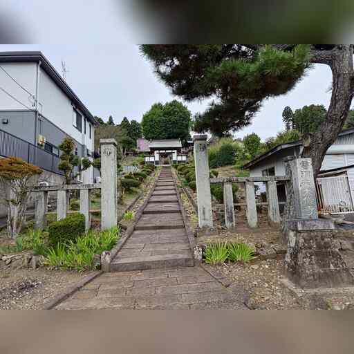 県道から分かれます。 石塔や顕彰碑、神社があります。 坂道を登っていきます。