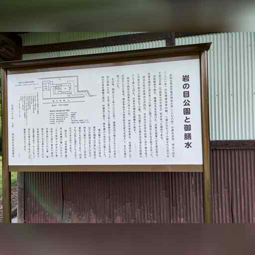 北上を続けると、岩の目公園と御前水の案内板が建っています。