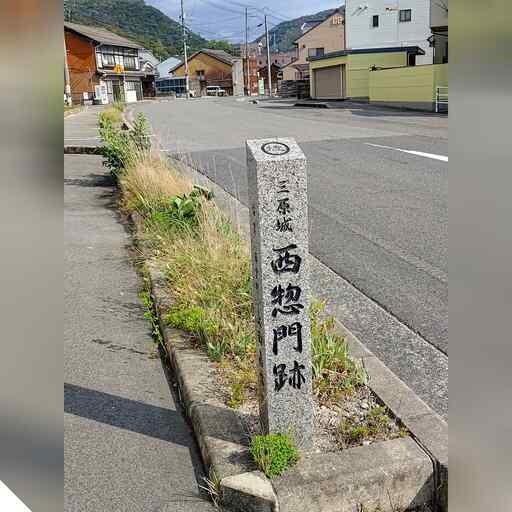 一里塚跡と三原城西惣門跡の標柱があり、続いて三原八幡宮の前を通ります。新宮浦橋を渡らずに、そのまま西へ進み続けます。
