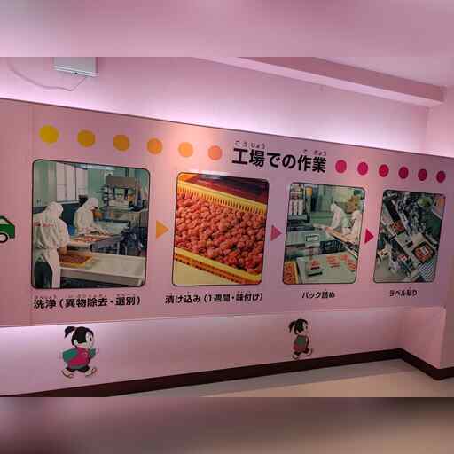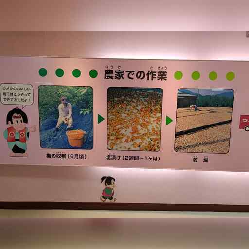 紀州梅干館があります。ここで紀州南高梅の工場見学ができます。 遅かったので、従業員が帰る準備をしていました。 また、嘉永年間の化石級な梅干しがあり、塩が浮き出て固まっていました。
