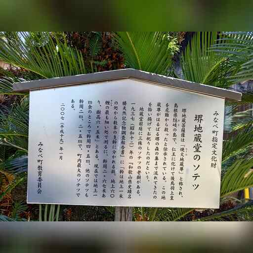 堺地蔵堂があり、そこに大きなソテツが3株あります。 かなり進むと海岸に2つの石があり、清姫(安珍・清姫の伝説)の袖摺岩と呼ばれているそうです。 田辺市に入ります。