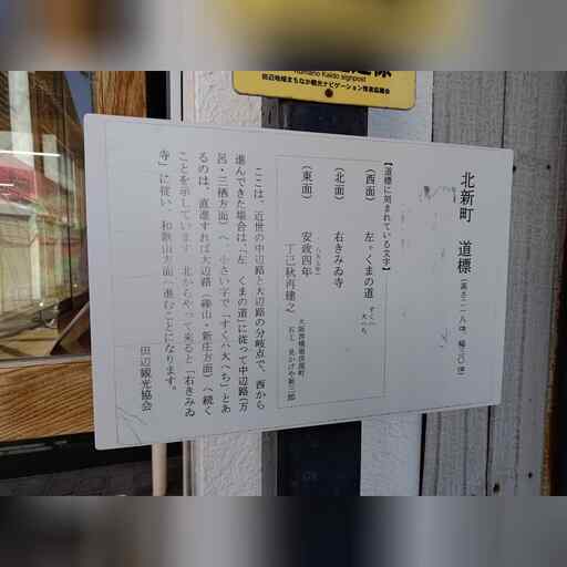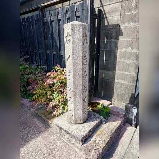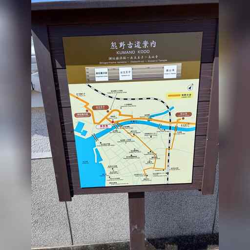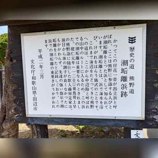 交番の所で国道から分かれます。ちなみにこの南にある半島の天神崎は、景勝地のようです。 さらに進むと、街道北側に面して合気道の創始者、植芝盛平の生誕地があります。 街道は南側の道に分岐します。 公園の中に潮垢離浜跡の案内があります。 これから中辺路に進む人が清めたようで、 藤原定家が、体調不良にもかかわらずやらせられたとあります。