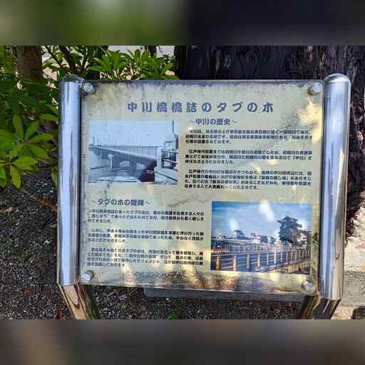 また、橋詰のタブノキの案内板と切株があります。移植できずに伐採になったとあります。
