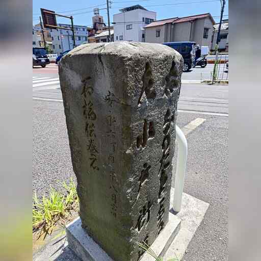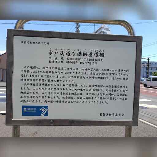 国道6号に接するあたりから北に曲がりますが、すぐ近くの成田街道(佐倉道)への分岐点に、水戸街道石橋供養道標(安永年間)が建っています。